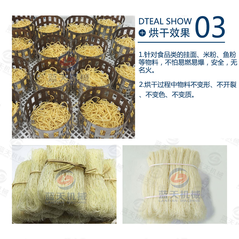 ④不同地域和米粉的種類(lèi)不同,一般使用米粉烘干機(jī)設(shè)備的烘干時(shí)間在8-12小時(shí)。這樣烘干出的米粉不變色,不會(huì)斷,干度均勻,口感佳,復(fù)水性好!同樣適用于面條、紅薯粉等烘干處理。